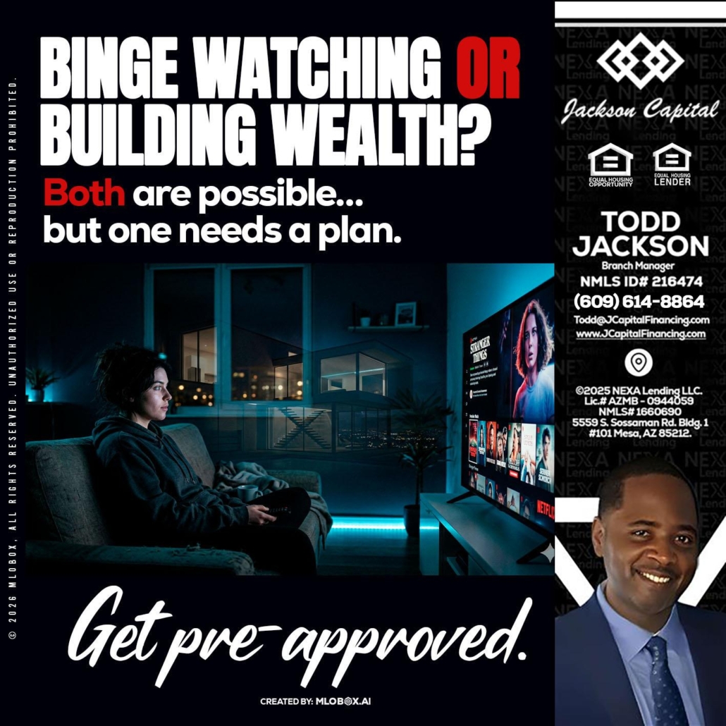 BINGE WATCHING - Jackson Capital -Branch ManagerHi, my name is Jackson Capital. I’m a Loan Officer with NEXA Lending LLC., offering personalized mortgage solutions, fast customized quotes, great rates and service with integrity.