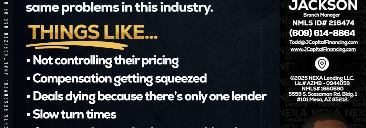 every Thursday - Jackson Capital -Branch ManagerHi, my name is Jackson Capital. I’m a Loan Officer with NEXA Lending LLC., offering personalized mortgage solutions, fast customized quotes, great rates and service with integrity.