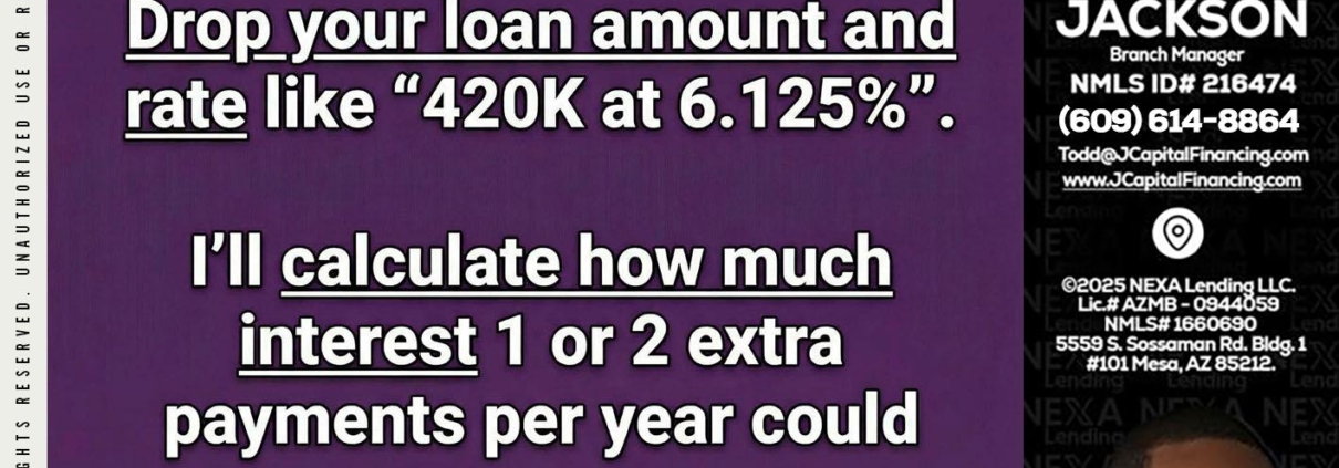 ONE EXTRA - Jackson Capital -Branch ManagerHi, my name is Jackson Capital. I’m a Loan Officer with NEXA Lending LLC., offering personalized mortgage solutions, fast customized quotes, great rates and service with integrity.