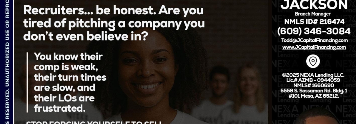 RECRUITING - Jackson Capital -Branch ManagerHi, my name is Jackson Capital. I’m a Loan Officer with NEXA Mortgage LLC., offering personalized mortgage solutions, fast customized quotes, great rates and service with integrity.